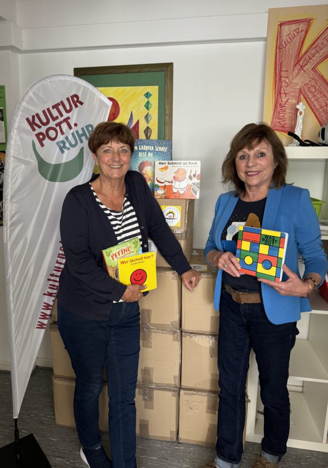 Wir können wieder nigelnagelneue Kinderbücher an unsere großen und kleinen KulturgastKinder verschenken!!! 😉 Möglich macht das die Siftung Selbst.Los! Wir sagen ein riesiges Dankeschön und wünschen unseren Kindergästen großes Lese- oder Vorlesevergnügen!!! Foto v.l.: Annette Beermann – Beisitzerin, Marita Heiliger – Vorsitzende