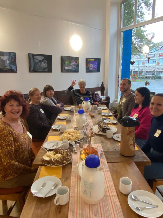 Das Team des KulturPott Ruhr bei einem Kaffeetrinken mit Kulturgästen aus der Ukraine in der Ladenkirche Mülheim. Der leckere selbstgebackene Kuchen war das Gastgeschenk der ukrainischen Kulturgäste. Tolle Gespräche, leckerer Kuchen, gelungener gemeinsamer Nachmittag. Fazit: „Eine sehr schöne wiederholenswerte Sache!“ (Zitat: Marlies Rustemeyer) Foto v. l.: Bettina Frontzek, Natalie Zavadska, Elena Uschewa, Marlies Rustemeyer, neuer…